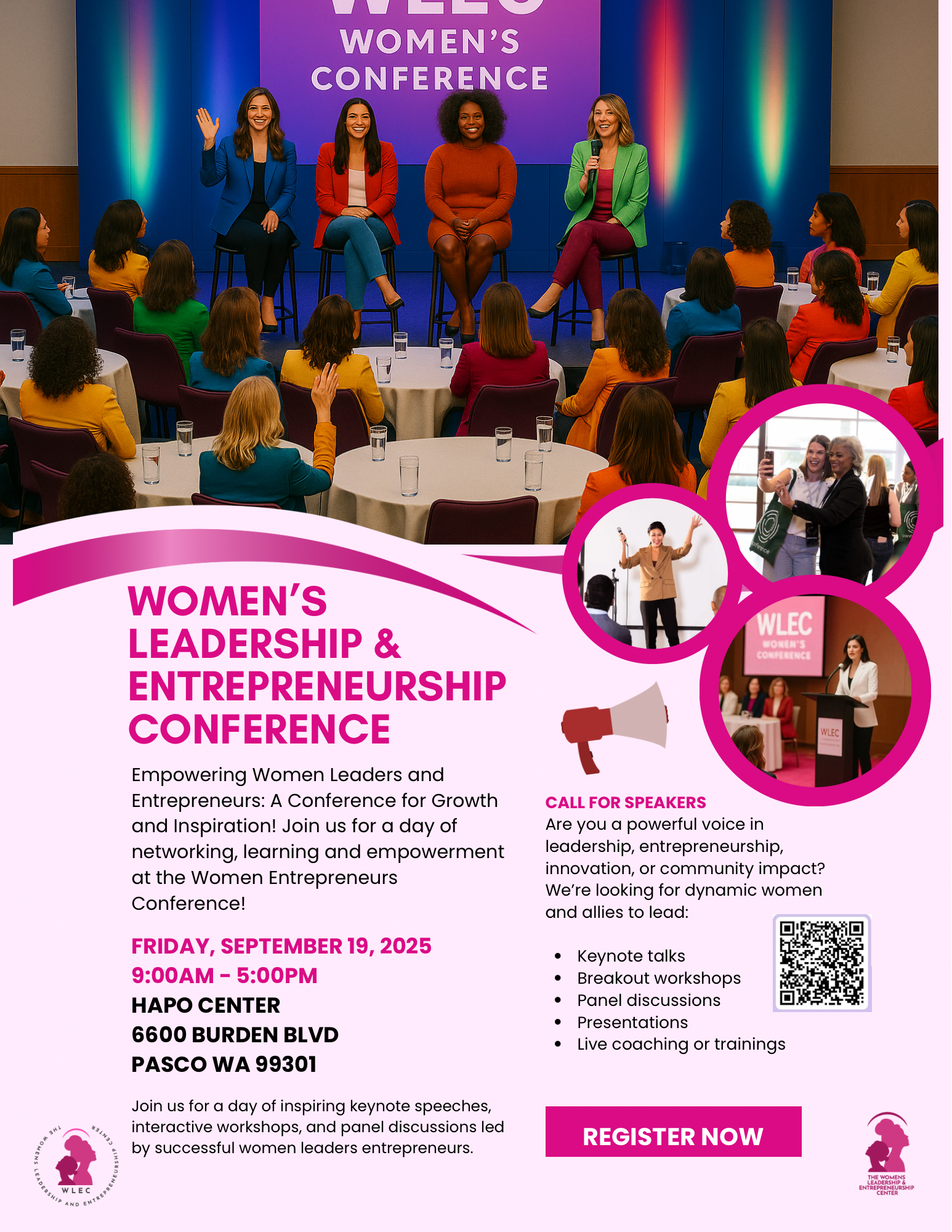 Join us for the First Annual Women's Leadership & Entrepreneurship Conference, hosted by the Women's Leadership and Entrepreneurship Center in Tri-Cities, Washington! This exciting full-day event will take place on Friday, September 19, 2025, from 9:00 AM to 5:00 PM at the HAPO Center, located at 6600 Burden Blvd., Pasco, Washington.